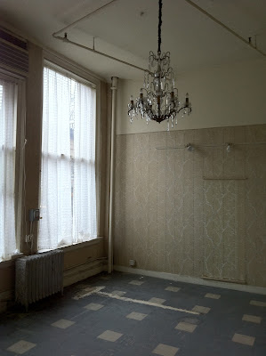 Patterned Wallpaper and Checked Linonleum with Chandelier